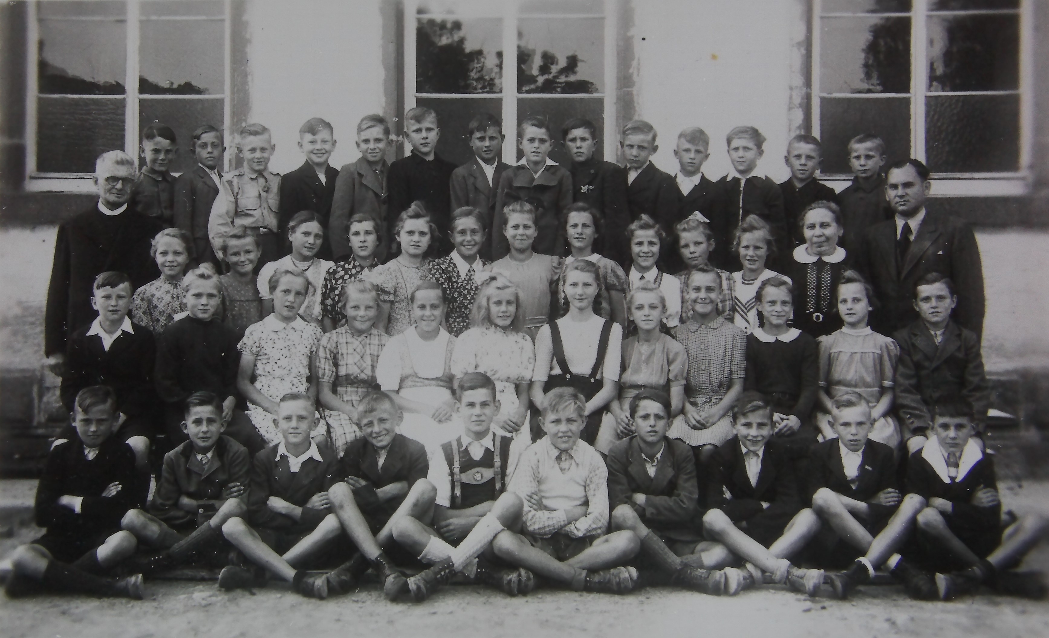 Die Kinder waren noch im Winter 1944 – 45 zu Schule gegangen. Aber diese Monate standen ganz unter den Ereignissen der letzten Kriegszeit : Fliegeralarm, Tieffliegerbeschuss ,( der Vater einer Geschwisterschar , Anton Josef Schneider wurde bei der Feldarbeit am 11. April 1945. Beschossen und getötet , nachdem er noch seine kleinen Kinder retten konnte , die er unter das Gefährt gesetzt hatte ) , Kohlenferien und Belegung der Schulräumer durch die SS ( dies führte zu blutigen Kämpfen bei der Einnahme durch die amerikanischen Truppe : 36 junge Soldaten fielen ihnen zum Opfer , - 12 Gehöfte gingen in Flammen auf und 80 Stück Vieh sind mitverbrannt .) Der Bestand an Schibüchern aus der NS-_Zeit war von amerikanischen Autos abtransportiert worden . Die Schule besaß nur eine kleine Anzahl von Fibeln der Notausgabe , die von der amerikanischen Militärregierung lizensiert war, drei bis vier Kinder bekamen zusammen ein Buch. Ich entdecke aber auch in höheren Schuljahren Kinder , die noch nicht lesen konnten. Auch mit ihnen musste ich Lesegruppen bilden .So konnte ich die Notfibeln den Kindern nicht mit nachhause geben, sondern musste sie in der Schule behalten für die Leseabteilungen der anderen Klassen. Was ich als Leseübung zuhause aufgab , mussten die Schüler erst auf die Tafel schreiben. Die Kleinen konnten auch das noch nicht . Ich schrieb es ihnen selbst auf die Tafel und auf graues Kriegspapier zu nächtlicher Stunde !Aber was hatten sie für Schreibwerkzeug ! Wer eine rechte Schiefertafel besass, war reich. Manche hatten nur blinde Scherben in Holzrahmen oder auch nur einen Schiefersplitter .Einige krizelten mit Stricknadel und Nägel auf das Tafelstück .Einzelne hatten Fetzen von Einwickelpapier , auf sie mit Bleistifstummeln schmierten. Das Herz tat mir weh beim Austeilen der weniger Tafeln , Hefte, Griffel und Bleistifte , die wir für die Schule bekommen hatten.